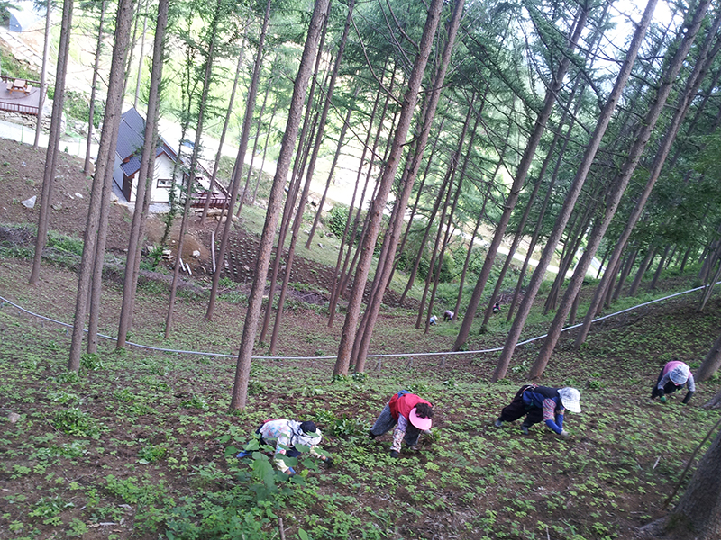 산양산삼밭 풀메기 작업에 아주머니들이 투입되셨다.