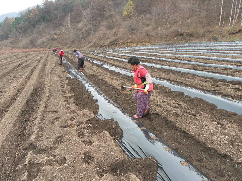 비닐을 씌운 두둑에는 괭이를 들고 흙을 올리고 계시네요.